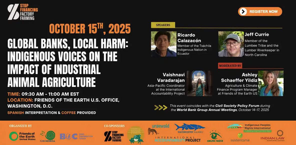 Please join the petition to World Bank and ADB against nuclear finance, watch out for the Digital Day of Action, forward letters from climate groups to governors and executive directors and check for the days of global action Stop the Harm! Cancel the Debt! Also, don’t miss events like the “Indigenous Voices on the Impact of Industrial Animal Agriculture”.